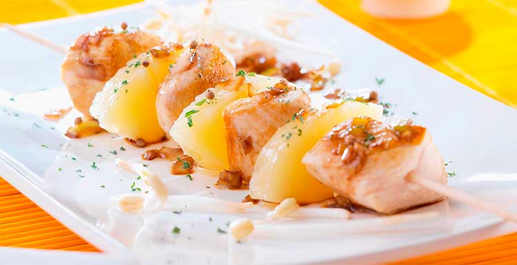 Los pinchos o brochetas de pollo con piña son una idea estupenda para comer, los puedes acompañar de un poco de arroz integral con curry, un sabor que potencia el contraste con la piña y está delicioso.