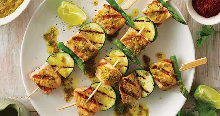 Brochetas de salmón con calabacín y espárragos, ideales para consumir pescado de forma distinta, y le dan un toque especial a un plato, que podemos combinar con un poco de quinoa al vapor, o arroz integral al vapor.